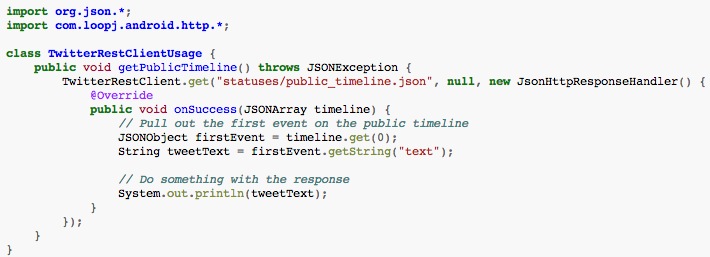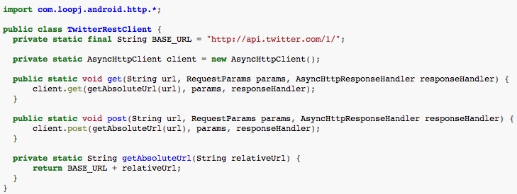 官方推薦的使用方法,使用一個(gè)靜態(tài)的請(qǐng)求對(duì)象,我們來(lái)看看官方例舉的一個(gè)訪問(wèn)Twitter的API的例子: