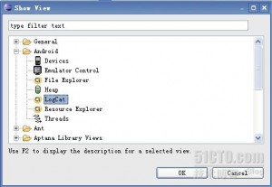 啟動Eclipse,在Window->Show View會出來一個對話框,當我們點擊Ok按鈕時,會在控制臺窗口出現(xiàn)LogCat視窗.如下圖: