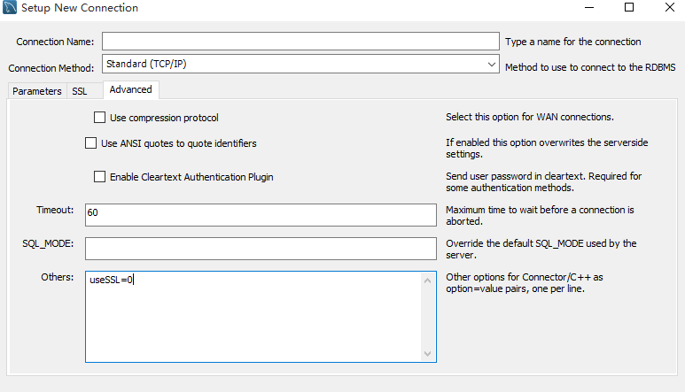 解決方案一:不使用SSL,在Advance TAB頁的others框中輸入?yún)?shù):useSSL=0,就可以連接上了。