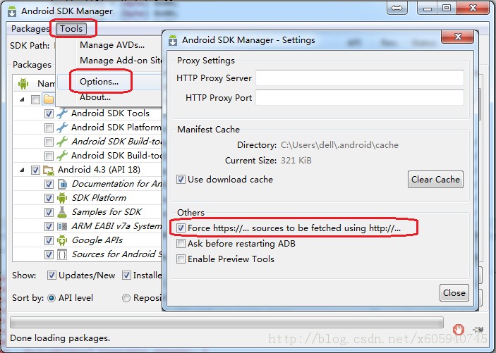 修改方法是:如下圖,在Android SDK Manager->Tools-Options...選項界面,